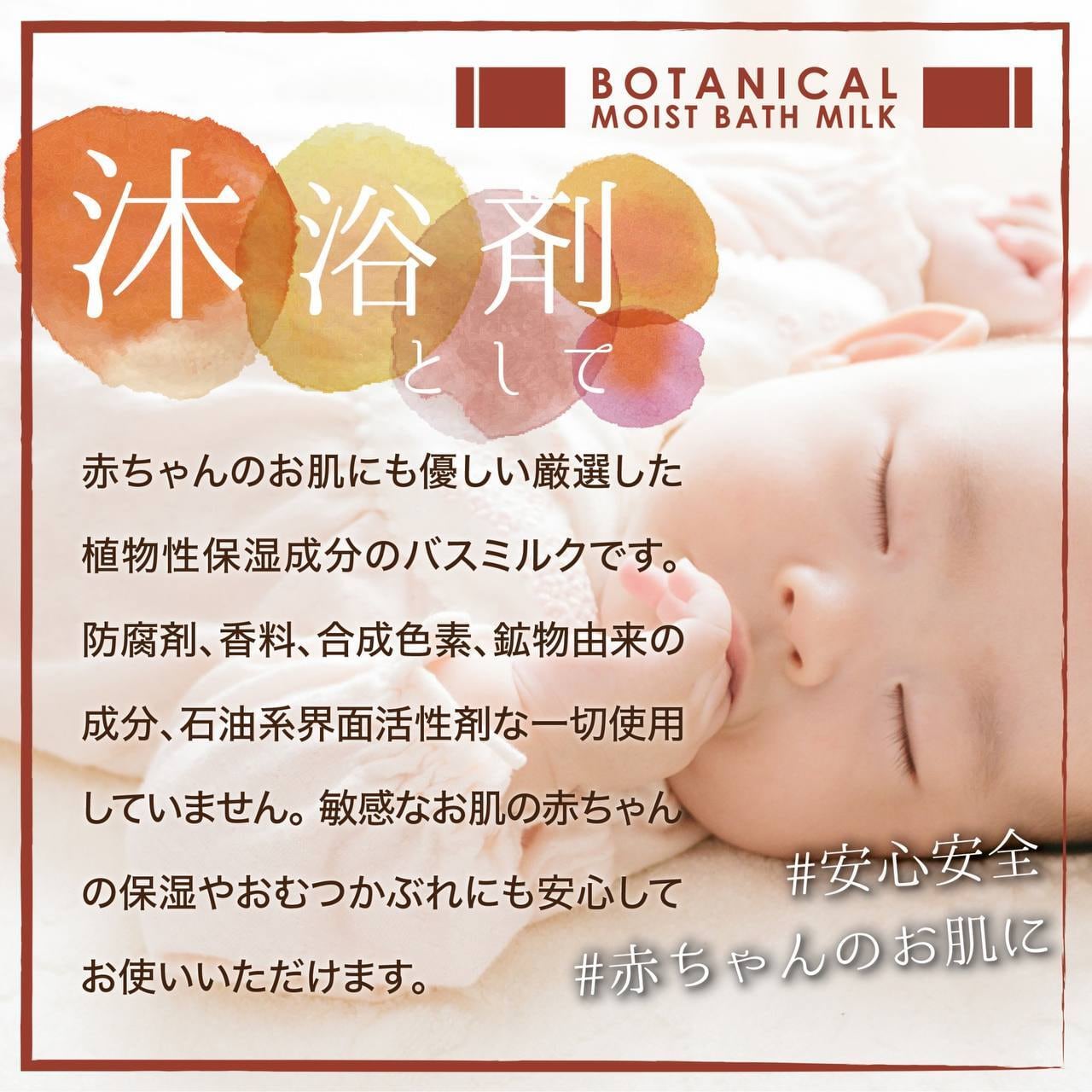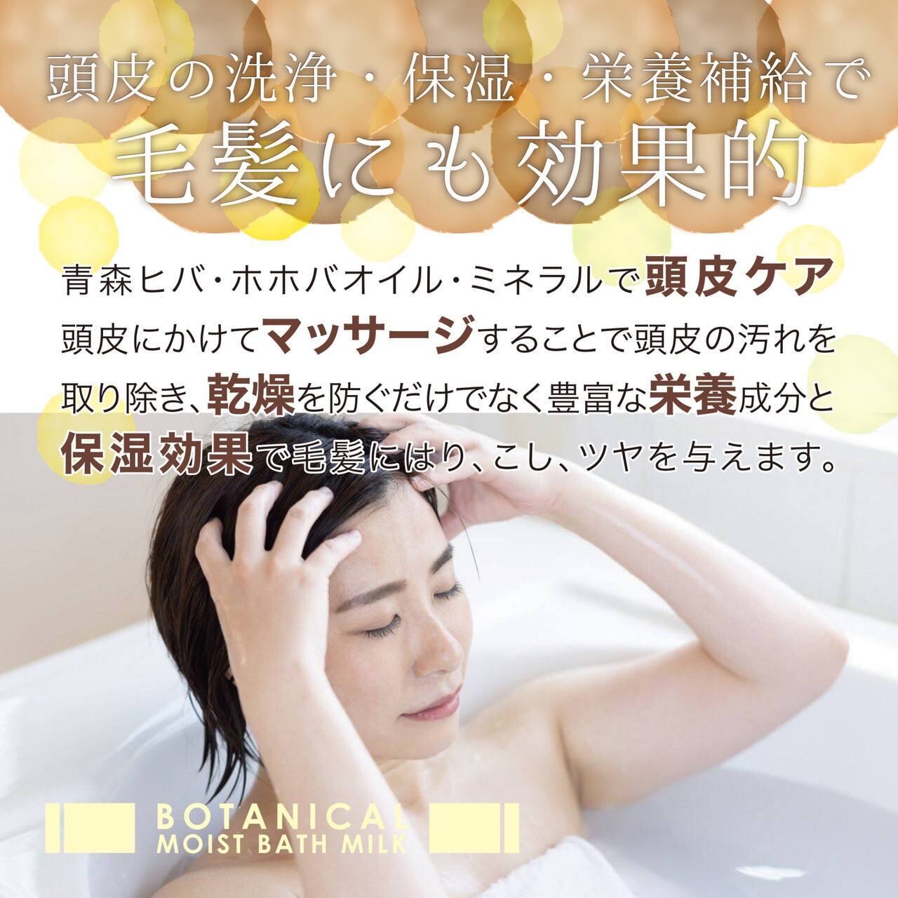青森ヒバ、ホホバオイル、天然ミネラルを豊富に配合した、入浴するだけで頭皮からつま先まで全身をしっかり保湿し、スキンケア・頭皮ケア・背中ケアなどに優れたボタニカル成分のバスミルクです。