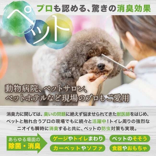 除菌スプレーとしてだけでなく、消臭力も非常に高いので、ペット関連の消臭や衣類や靴、玄関や車内の消臭スプレーとして、その他にも、これからの季節は赤ちゃんの虫除けスプレーとして、エステサロンではアロマテラピーとしても使用していただいております。